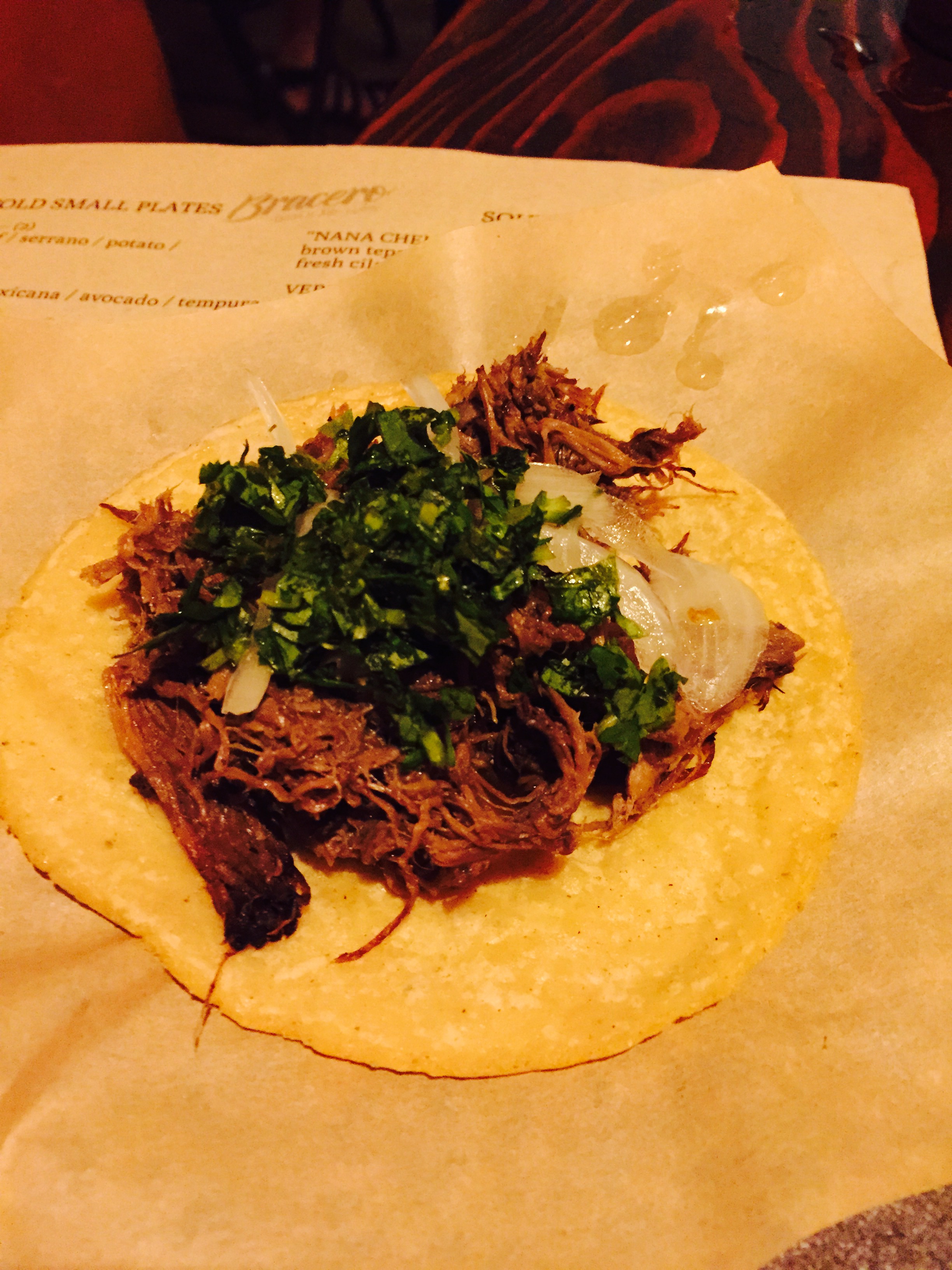 The same menu is served upstairs and downstairs. In fact, there are even two kitchens. The left side of the menu comes from the kitchen on one floor, and the right side of the menu comes from the kitchen on the other floor. Here lies the biggest challenge of Bracero. . . . How do you run two different restaurants with a common menu, where both are sourcing food from two separate kitchens? For example, a cold plate we ordered (prepared in kitchen 1) was supposed to be served with fresh tortillas (which were prepared in kitchen 2). The tortillas arrived about 10 minutes after the paired dish.