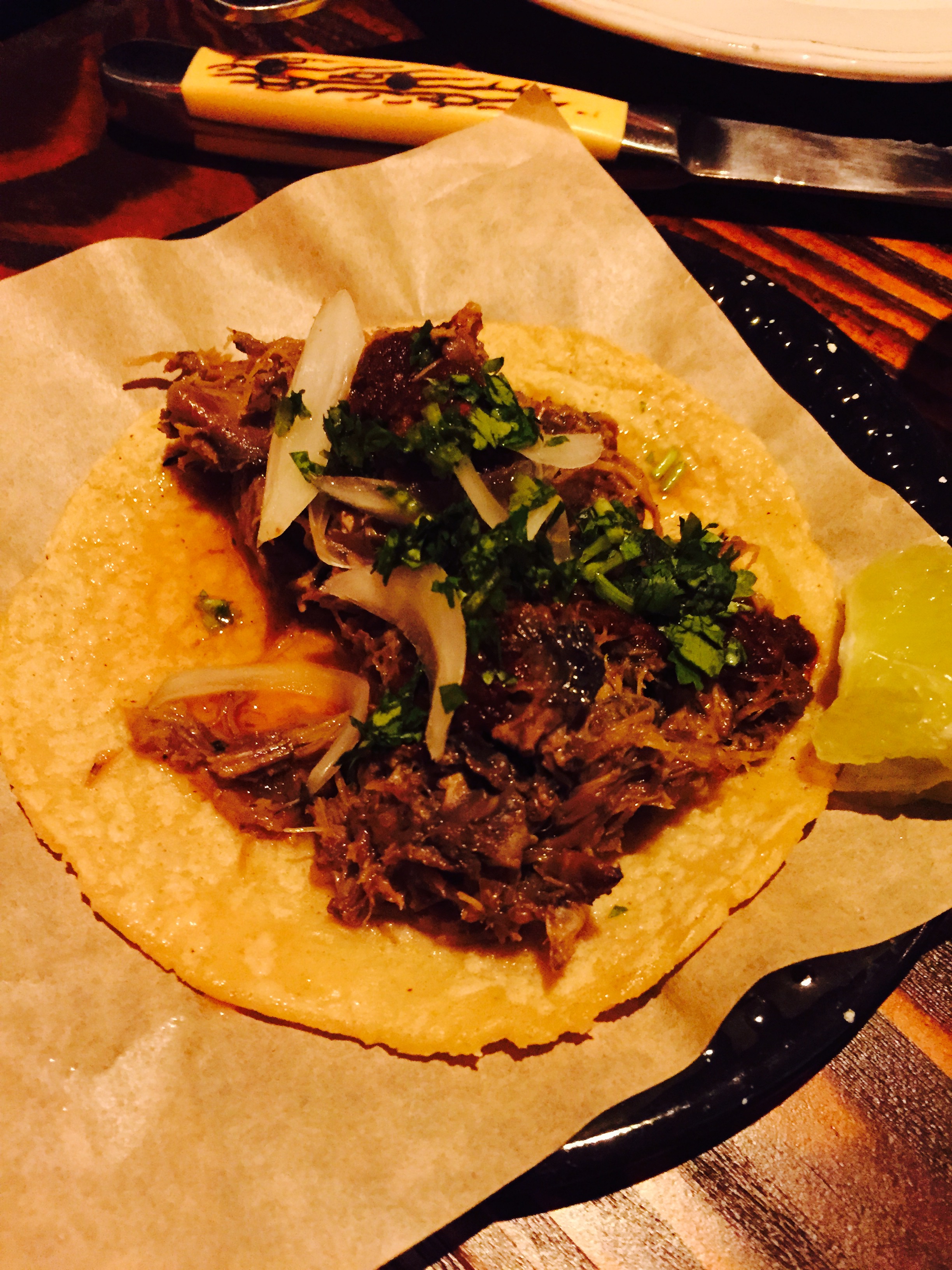 On our first visit we sampled two of the street tacos (Casa Plascencia Beef Cheeks and Lamb Neck Barbacoa). Both were surprisingly under-seasoned. We chalked this up to a new kitchen staff rather than a flaw in Chef Plascencia’s recipes. On our second visit, we tried the Mediterranean (Gyro Style) Adobada and the Cook Pig’s Ranch Carnitas. Both were so delicious that they, alone, provide motivation to return for another meal here! The Adobada (marinated pork) is served in a flour tortilla with jalapeño tzatziki, olla beans and fresh pineapple. It’s a Greece-meets-Mexico Feta-Fiesta! Opa!