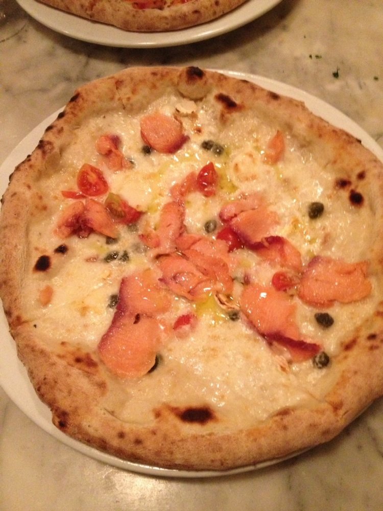 For yesterday’s visit we tried the Catarina which is topped with smoked salmon, brie cheese and grape tomatoes. It was bright and fresh tasting with a lightness that was a perfect counterpoint to our other selection, the Angela which included a red sauce, mozzarella, and a spicy salame calabrese (BF’s version of pepperoni). We wanted something a little heavier so we added some house made fennel sausage to our Angela pizza. I highly recommend this if you like spice and are looking for something hearty.