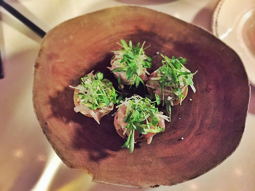With that said, let’s jump into the food. You need to know that the menu changes based on what the chefs can get in, or how they are feeling about certain products. However, so far, there are 4 items that have consistently been on the menu: Buttermilk biscuit, Baja yellowtail, carne cruda asada toast, and the Yodel. Also, the bulk of the menu is served as small plates/shared plates, which is an approach that I’m fully behind. As soon as you sit down order the biscuit. Don’t wait. Don’t look over the menu. ORDER THE BISCUIT!!! Order 2!!! It’s freaking delicious!!! It now comes with FOIE GRAS BUTTER!!!! Sorry, if I got a little too excited there, but it really is very good. I always say, when you go to a new restaurant, look for the simplest thing on the menu and order it. If it comes out awesome, then it’s a pretty good bet that everything else will also. Usually the simple stuff is not taken care of because they are so worried about the more complex things. However, the staff at J&I keep an eye on quality and the biscuit is stellar. We did order two of these along with the Baja yellowtail and the carne cruda asada toast ( this is our standing order when we come here). The foie gras butter was a welcome addition to the biscuit. The richness of the foie gras was perfect with the buttery-ness of the biscuit. I’m so glad they decided to change the yellowtail over to 4 individual tostadas instead of the one large one they used to give you, it makes for easier eating and sharing. The carne cruda asada is basically everything for carne asada but chopped up really fine and served raw with a quail egg on top; and it is delicious.