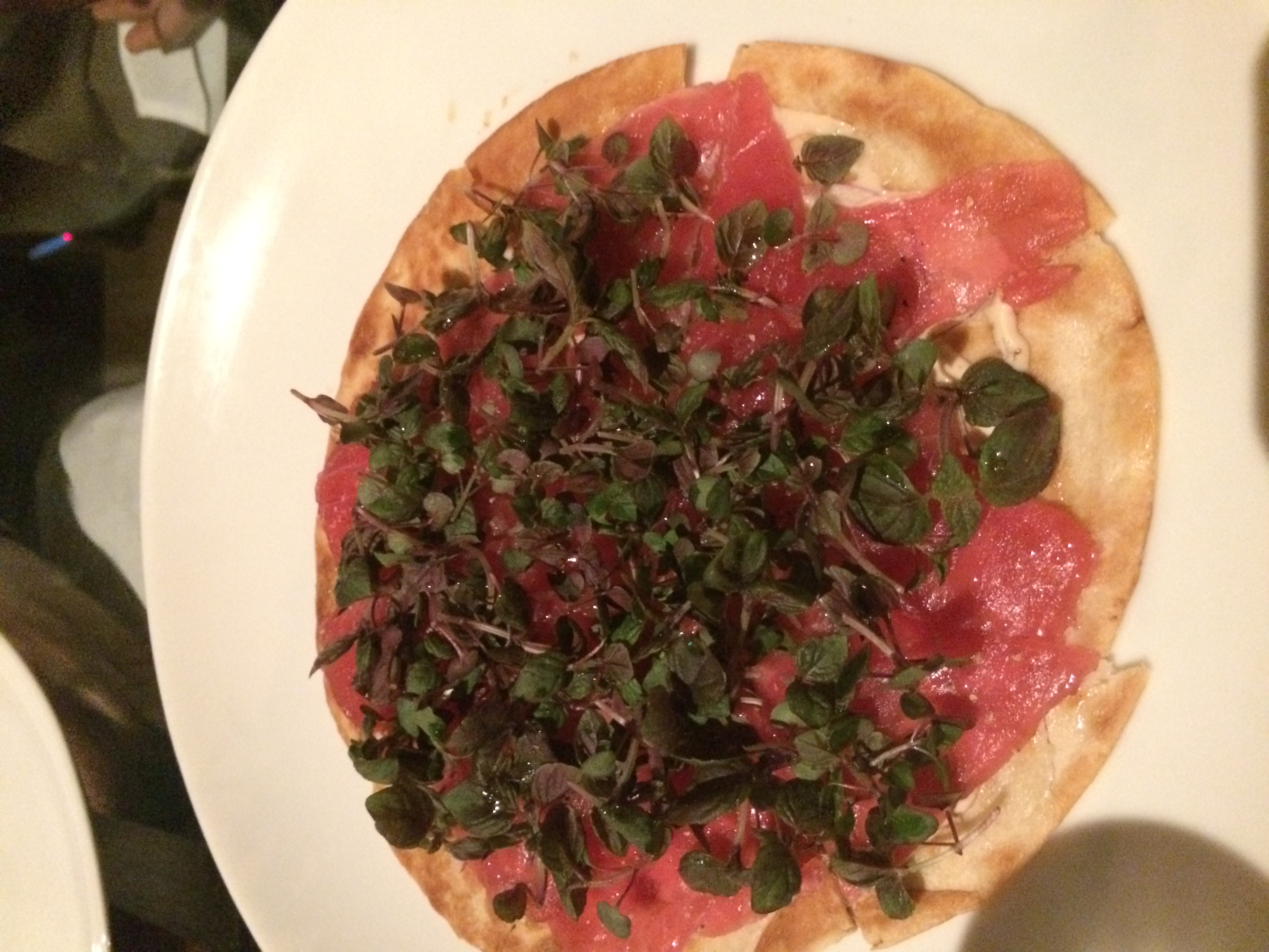 We started with the lobster tempura and big eye tuna “pizza”. Both of these seafood plates were bright, acidic and flavorful. The sweet ponzu sauce that accompanied the tempura was perfect.
